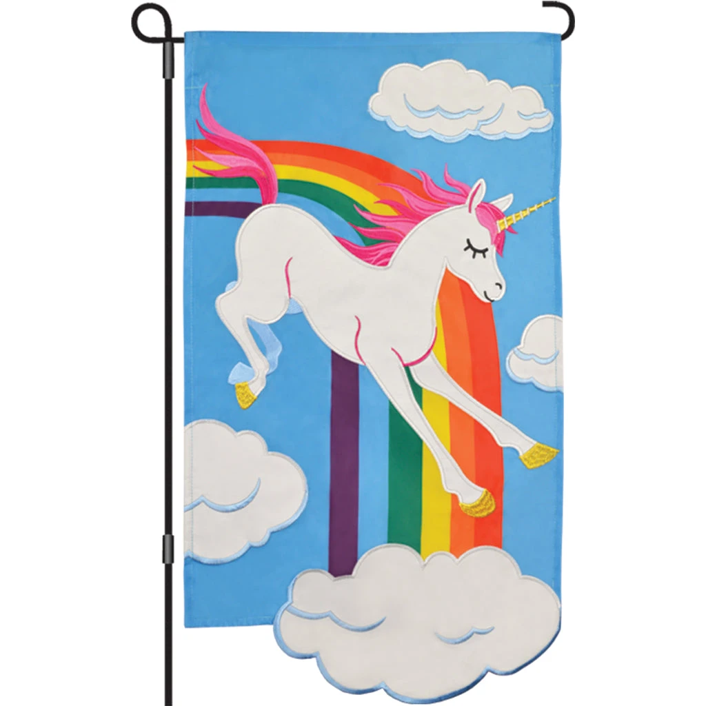 This flag features an extended design with colorful appliqué cutouts, detailed embroidery throughout the flag and fits on standard garden flag poles.